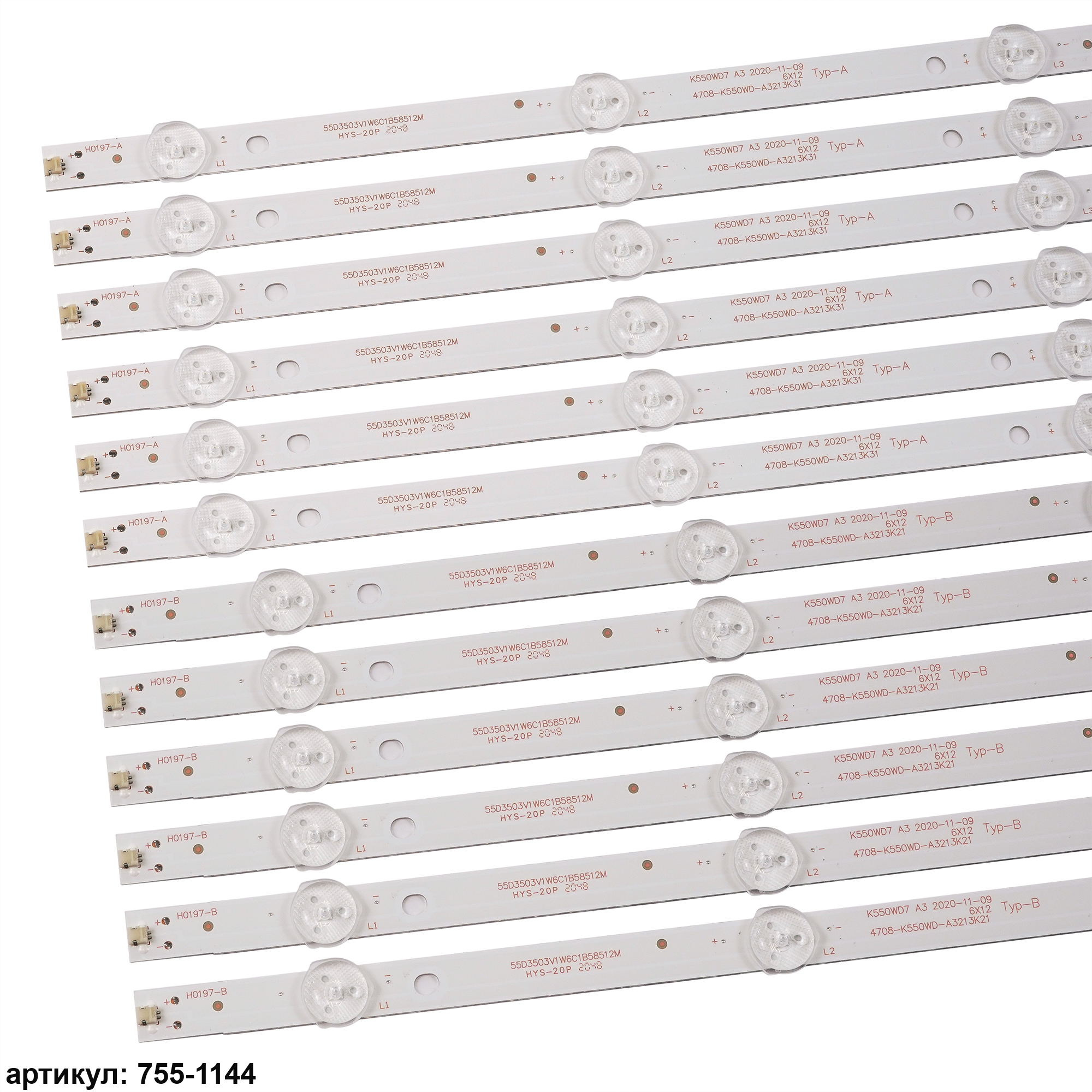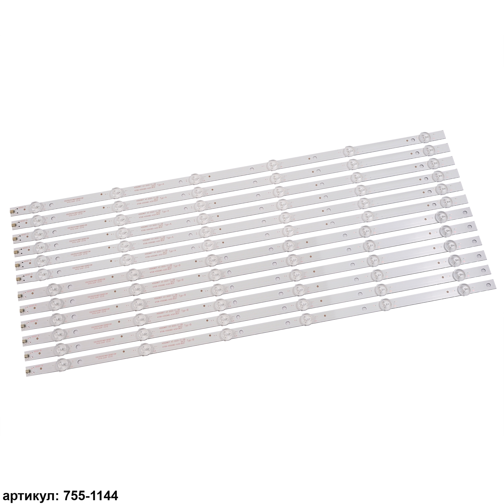 Комплект планок светодиодной подсветки для телевизора Philips 55' / (6 led 3V 584mm)Комплект включает в себя:- 6 планок 4708-K550WD-A3213K21 type a- 6 планок 4708-K550WD-A3213K21 type bСовместимые p/n: 4708-K550WD-A3213K21, 4708-K550WD-A3213K31, K550WD7 A3, 4708-K55WDR-A1213K11Подходит для моделей телевизора: Philips 55PFF5055/T3, 55PUF6001/T3, 55PUF6051/T3, 55PUF6056/T3, Rolsen RL-55D1509FT2C, Toshiba 55U7750EV, Dexp F55B7000T