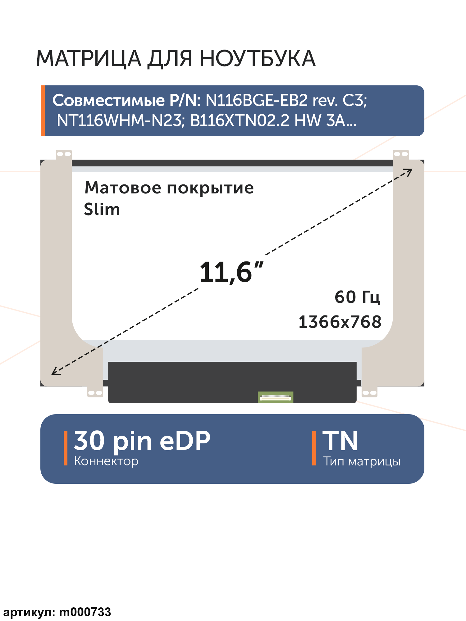 Матрица тонкая (Slim), крепления расположены вверху и внизу.Разъем подключения расположен справа внизу на внешней плате.Совместимые модели: N116BGE-E32, B116XTN01.0, N116BGE-E42 Rev.C1, N116BGE-E42 Bev.B1, N116BGE-E32