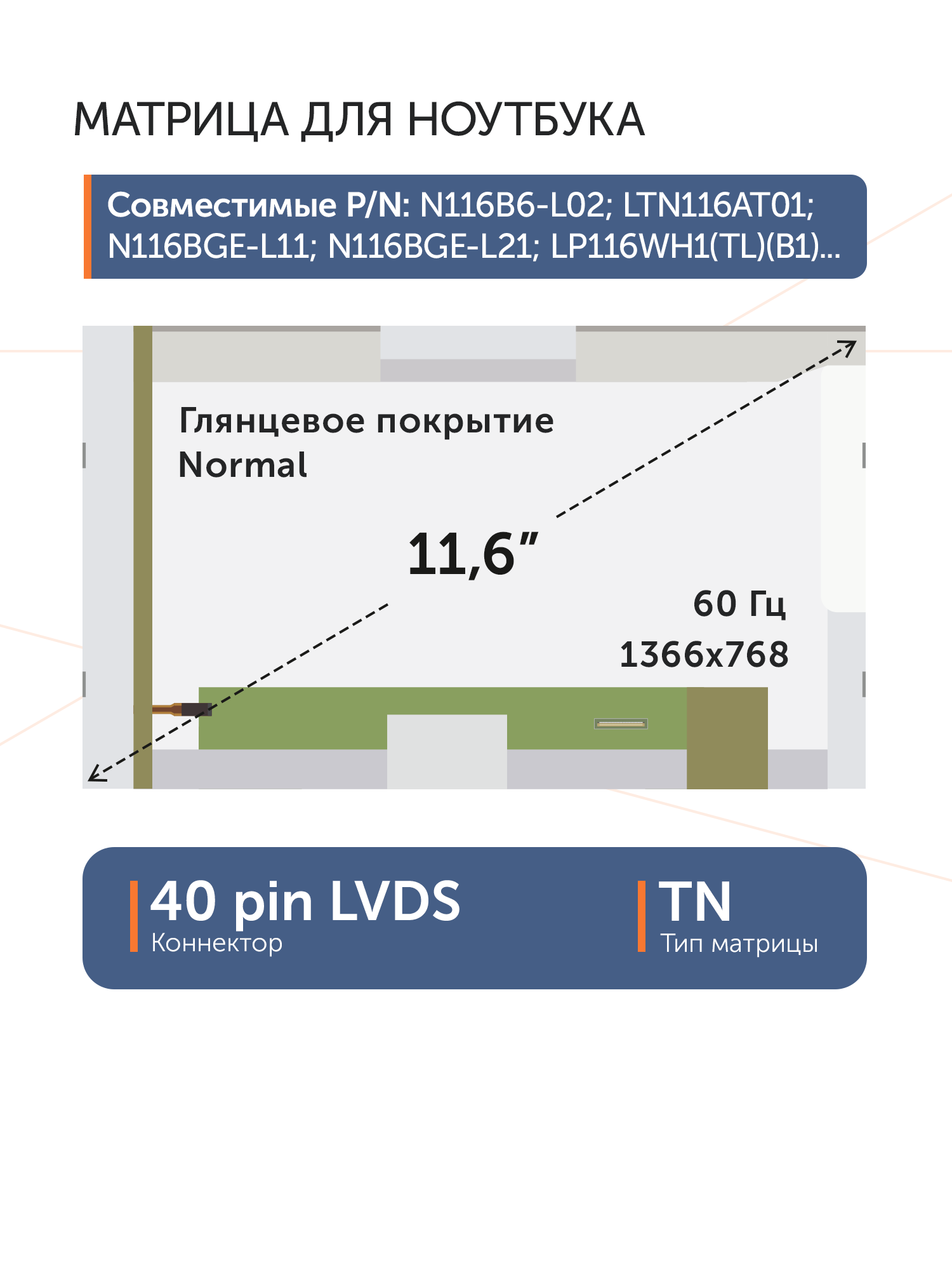 Совместимые модели: N116B6-L02, LTN116AT01, N116BGE-L11, N116BGE-L21, LP116WH1(TL)(B1), LP116WH1(TL)(N1), LTN116AT03, LP116WH1-TLB1, LP116WH1-TLN1, B116XTN01.0, B116XW02 V.0