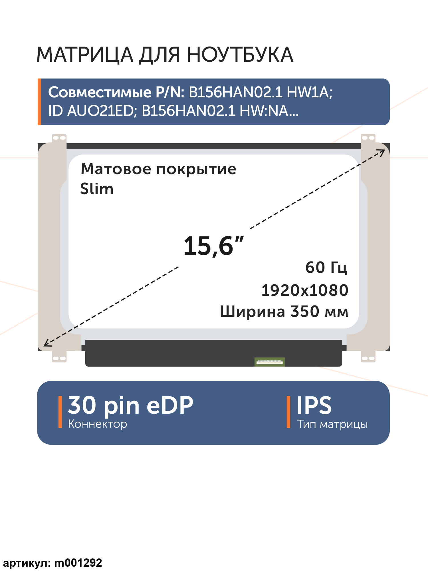 Совместимые модели: B156HAN02.2, B156HAN02.7, B156HAN02.3, B156HAN02.8, B156HAN02.1, LM156LFCL03, LM156LFCL13, LM156LFBL02, LM156LF4L01, LM156LFCL11, LM156LFCL01, LM156LFCL10, LM156LFAL01, LM156LF5L03, LM156LFCL05, LM156LFBL03, LM156LFCL07, LM156LFCL12, LM156LFAL02, LM156LF5L06, LM156LF5L04, LP156WF5(SP)(A2), LP156WF9(SP)(L2), LP156WF9(SP)(L9), LP156WF9(SP)(L1), LP156WF9(SP)(K1), LP156WF9(SP)(M3), LP156WF9(SP)(M9), LP156WF9(SP)(M1), LP156WF9(SP)(C1), LP156WFC(SP)(C1), LP156WFF(SP)(B1), LP156WFC(SP)(D2), LP156WFC(SP)(D3), LP156WFC(SP)(D5), LP156WFC(SP)(D7), LP156WFC(SP)(D1), N156HCA-EBB, N156HCA-EBA, N156HCA-EAB, NV156FHM-N48, NV156FHM-N35, NV156FHM-N45, NV156FHM-N4S, NV156FHM-N3D, LP156WFC(SP)(F6), NE156FHM-N41, NE156FHM-NS0, NV156FHM-N4X, TV156FHM-NH1