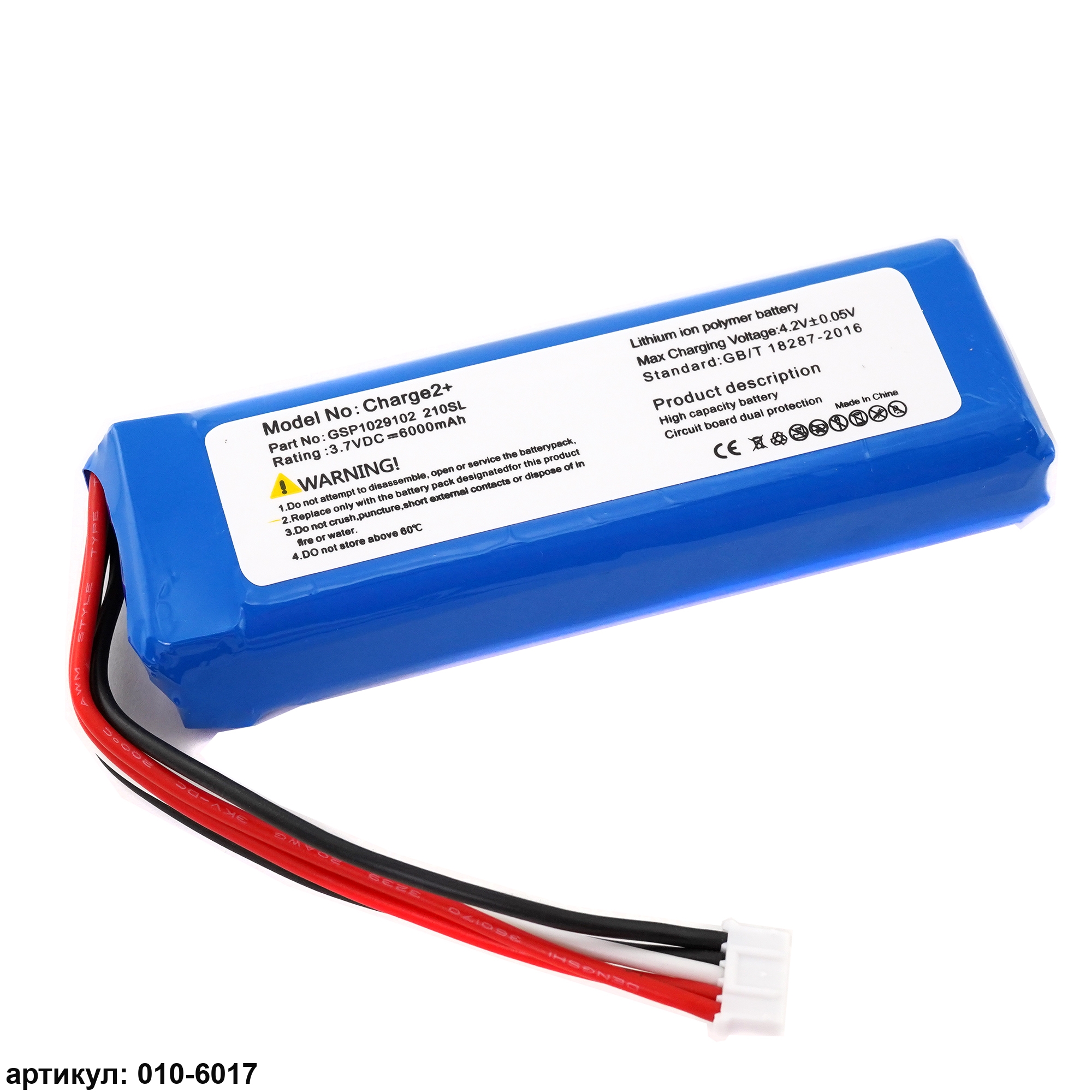 Подходит к колонкам: JBL Charge 2 Plus, Charge 2+ (3.7V 6000mAh) обратная полярностьСовместимые p/n: MLP912995-2P, MC15130115531, GSP1029102