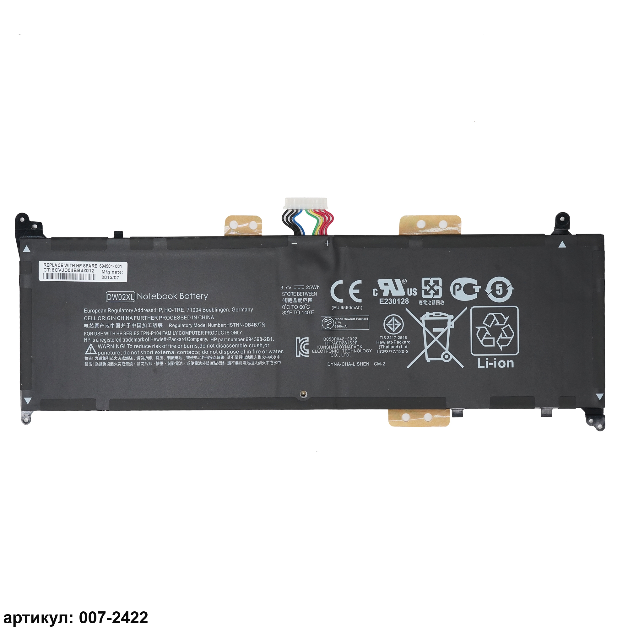 Совместимые P/N: DW02XL, HSTNN-IB4B, HSTNN-DB4B, TPN-P104, 694398-2C1, 694501-001