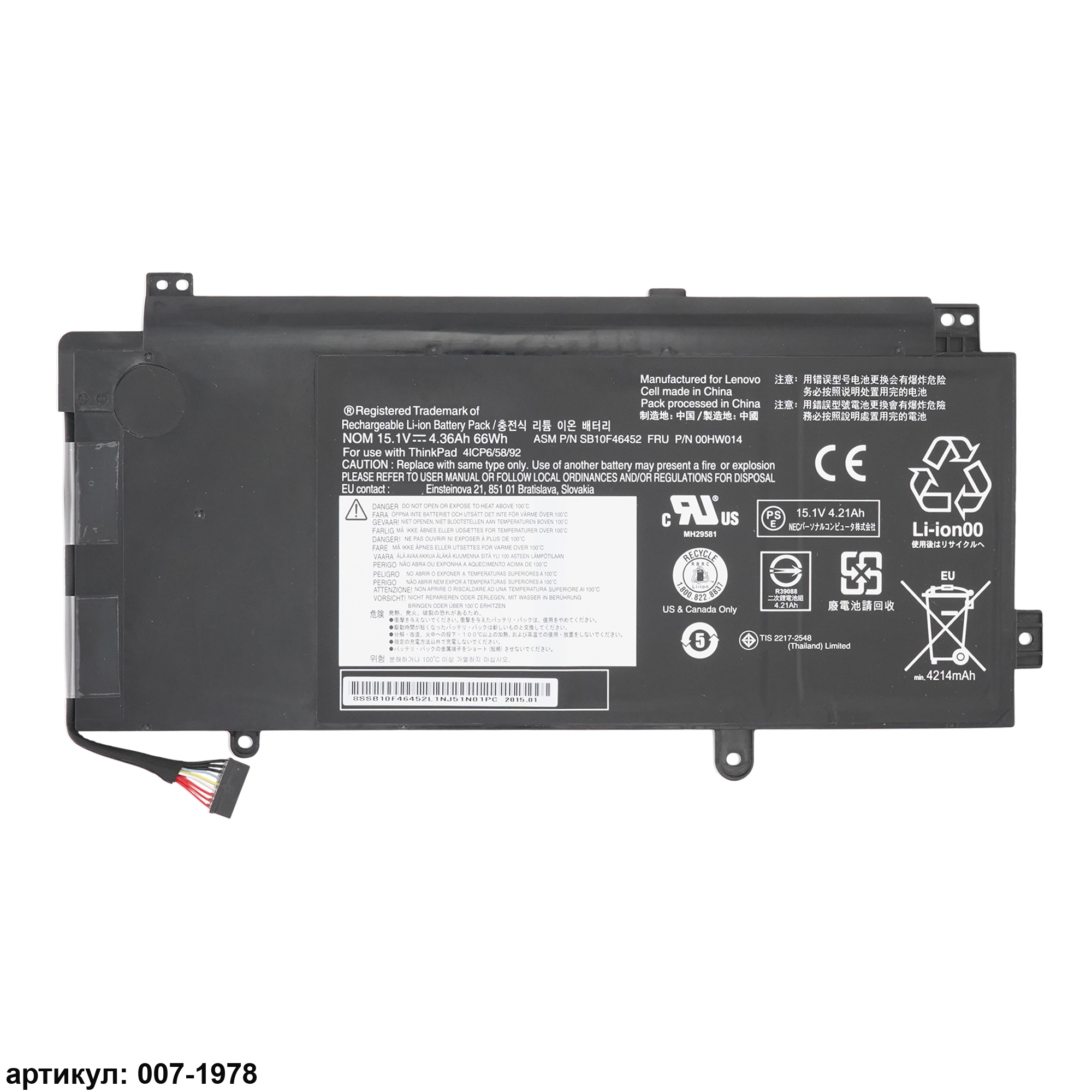 Подходит к сериям ноутбуков: Lenovo ThinkPad Yoga 15Совместимые P/N: 00HW014, 00HW015, SB10F46452