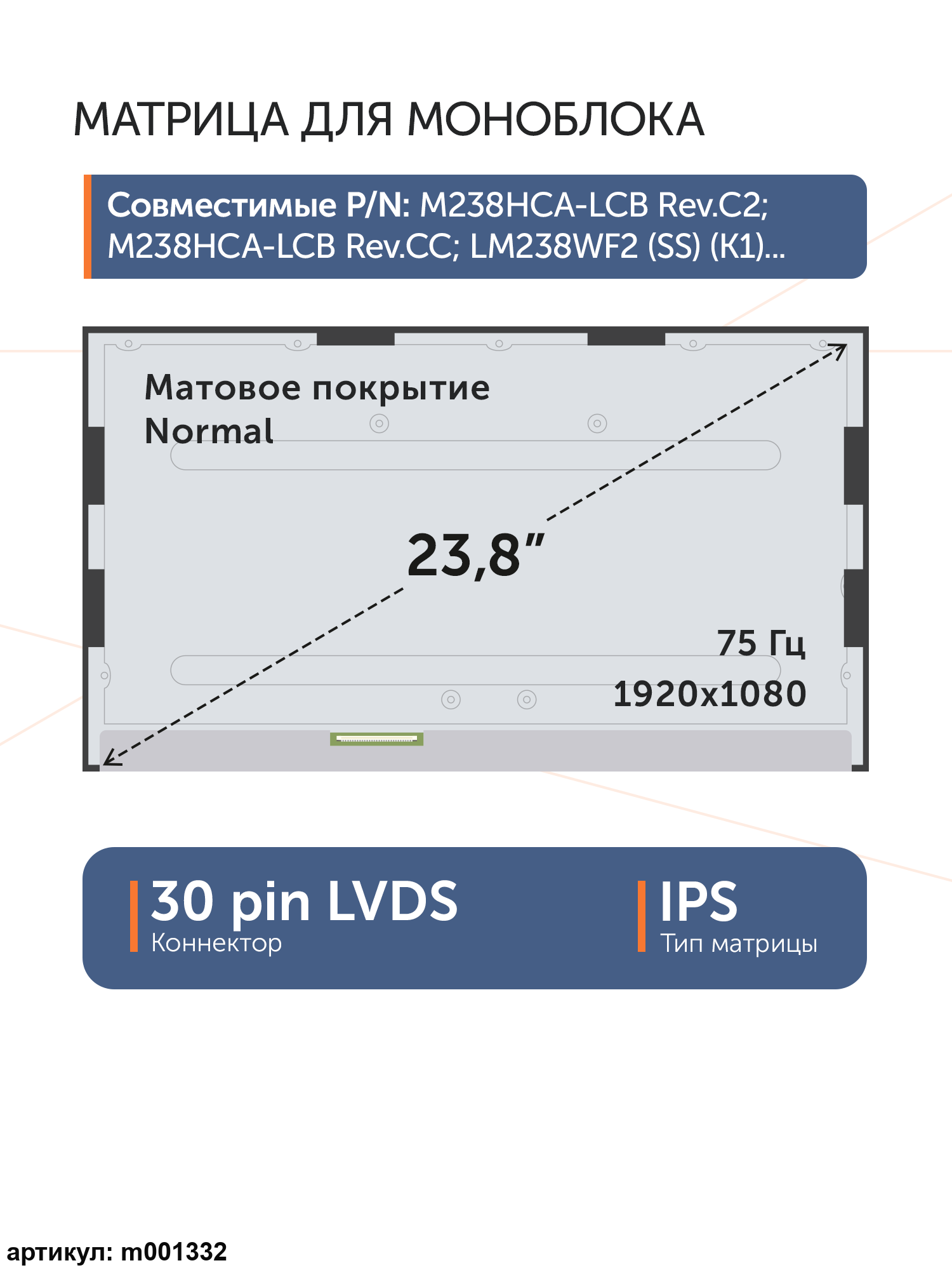 Совместимые модели: MV238FHM-N20, LM238WF2-SJF1, LM238WF2-SLK1, LM238WF2-SSA1, LM238WF2-SSC1, LM238WF2-SSD1, LM238WF2-SSE1, LM238WF2-SSF1, LM238WF2-SSF2, LM238WF2-SSG1, LM238WF2-SSG2, LM238WF2-SSG3, LM238WF2-SSK1, LM238WF2-SSL1, LM238WF2-SSM1, LTM238HL04, LTM238HL06, M238HCA-L3B Rev.C2, M238HCA-L3B Rev.C1, LM238WF2(SS)(P1), M238HCR-L3B, LM238WF2(SS)(M1), LM238WF2(SS)(M3), LM238WF2(SS)(K3), LM238WF2(SS)(K1), M238HCA-L3B, M238HCA-L3B REV.C2, M238HCA-L3B REV.C4
