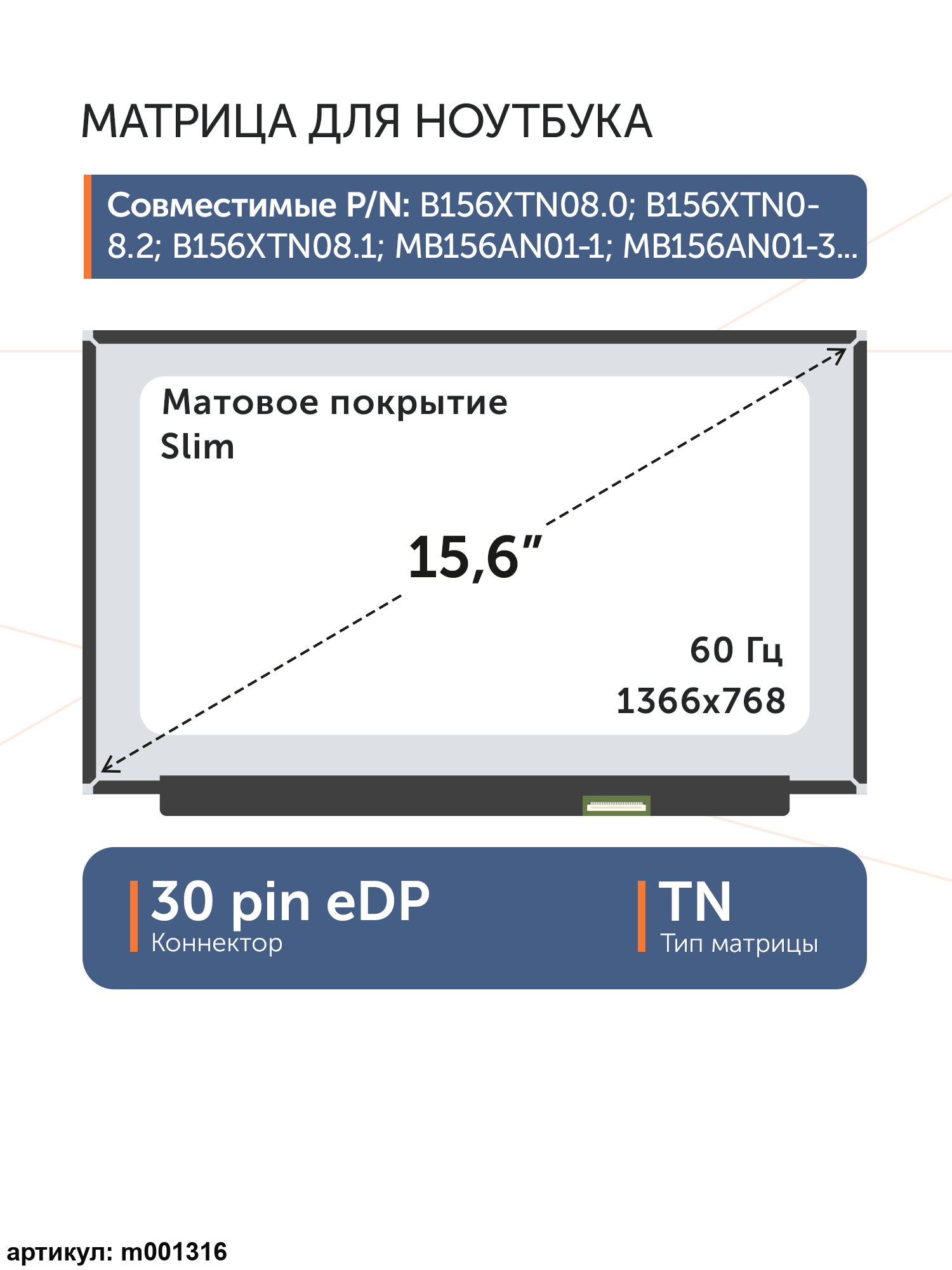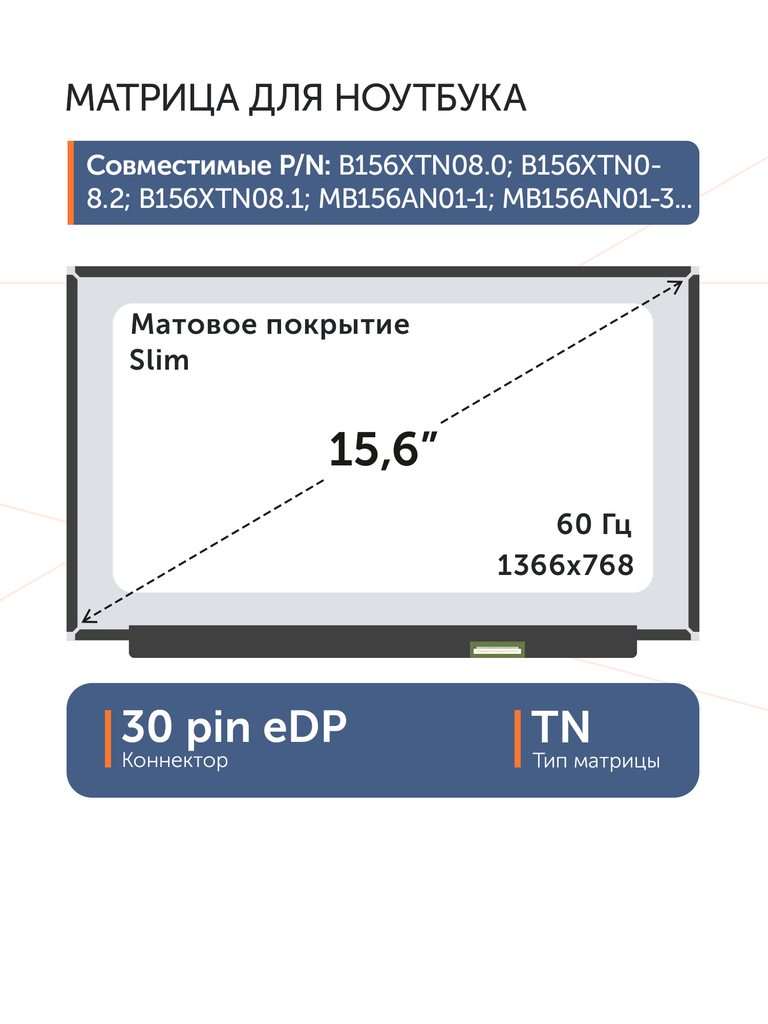 Матрица стандарт (Slim), без креплений.Разъем подключения расположен справа внизу на внешней плате.Совместимые модели: NT156WHM-N44, N156BGA-EA3 Rev.C3, N156BGA-EA3 Rev.C2, NT156WHM-N34, N156BGA-EB3, NT156WHM-N49, NT156WHM-N30, NT156WHM-N40, B156XTN08.0, B156XTN08.1, MB156AN01-3, NT156WHM-N35, NT156WHM-N44 V8.0, NT156WHM-N48