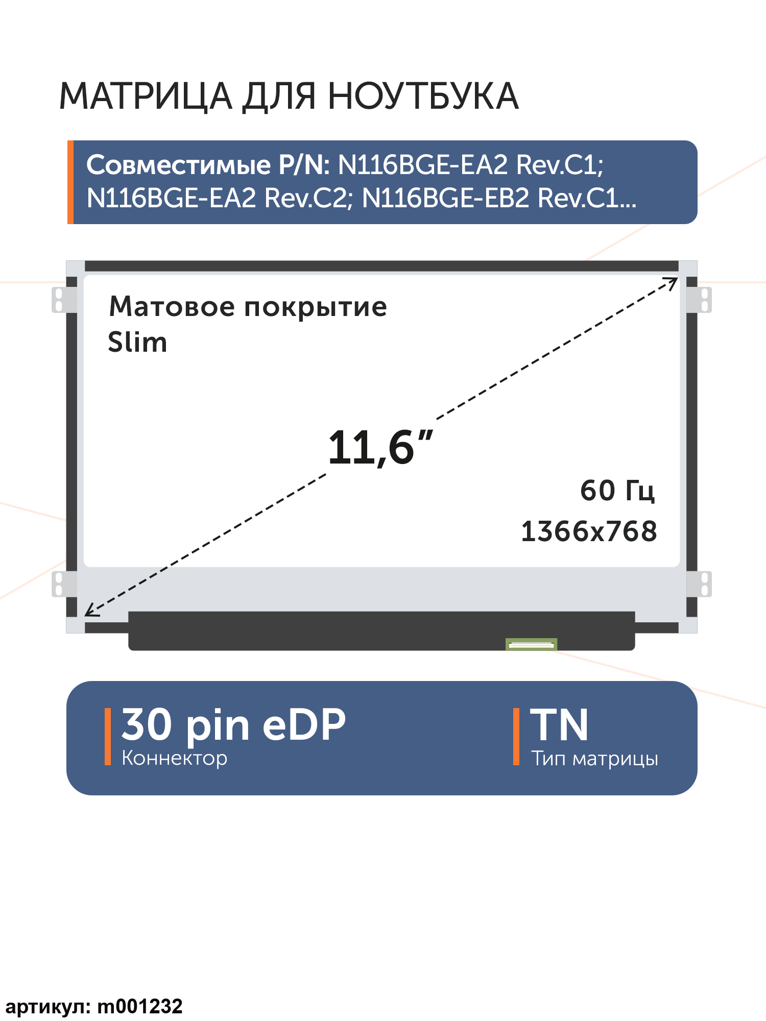 Матрица тонкая (slim), крепления расположены слева и справа.Разъем подключения расположен справа внизу на внешней плате.Совместимые модели: N116BGE-EA2 Rev.C1, N116BGE-EA2 Rev.C2, N116BGE-EB2 Rev.C1, B116XTN02.1, B116XAN02.0, N116BGE-EB2 Rev.B1, N116BGE-EA2 Rev.C6, N116BGE-EA2 Rev.C5, N116BGE-EA2 Rev.C4