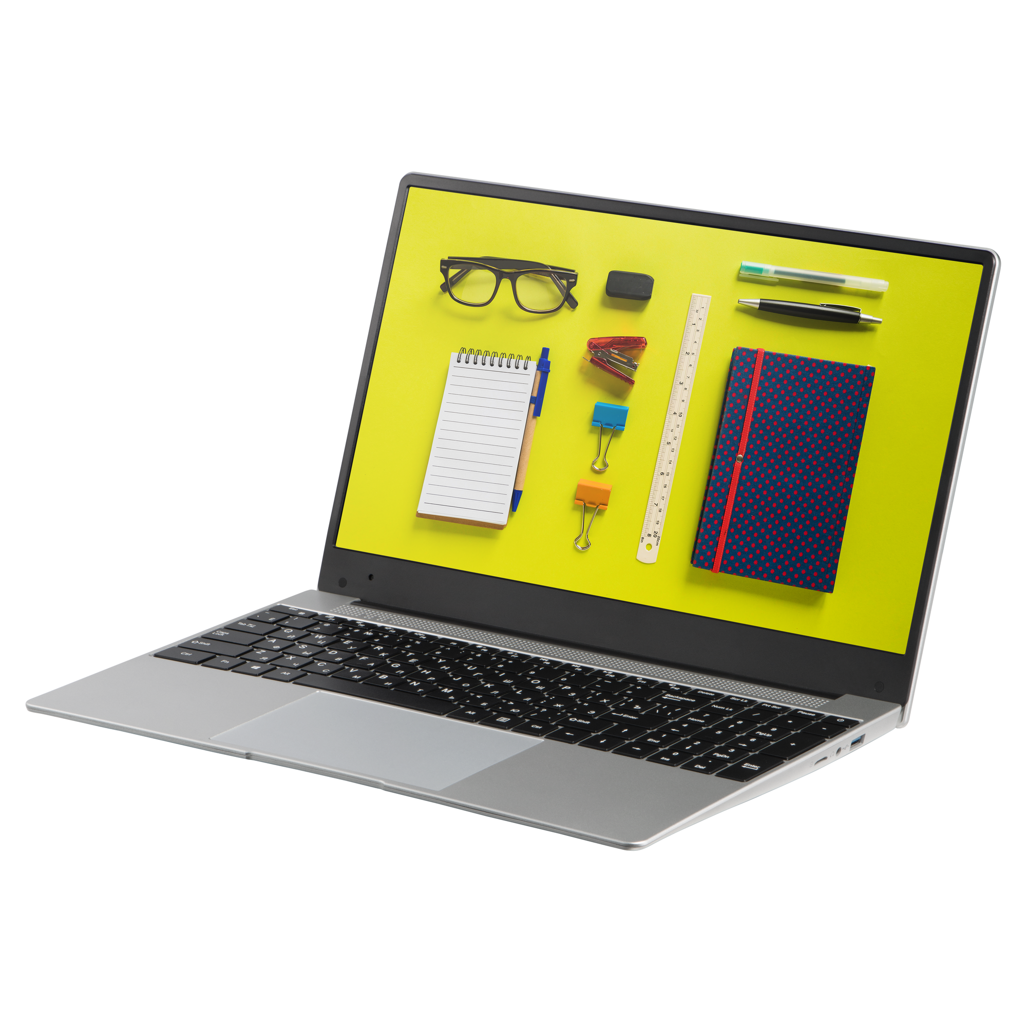 Корпус ноутбука выполнен из твердого полимерного пластика, придающего легкости и прочности. Этот материал обладает высокой устойчивостью к механическим воздействиям, царапинам и потёртостям, а также снижает вес устройства, что делает его удобным для переноски.
