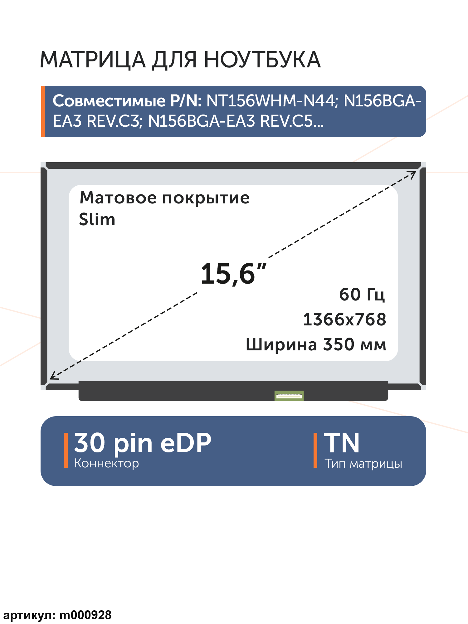 Совместимые модели: NT156WHM-N44 V8.0, NT156WHM-N49, NT156WHM-N40, NT156WHM-N30, N156BGA-EA3 rev. C2, N156BGA-EA3 rev. C3, NT156WHM-N35, B156XTN08.0, N156BGA-EB3, B156XTN08.1, NT156WHM-N48, NT156WHM-N34
